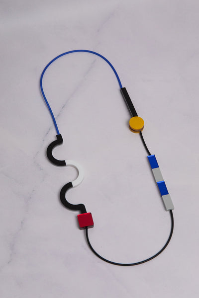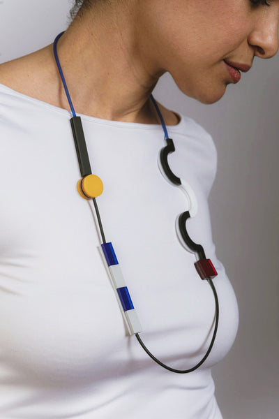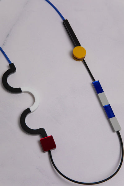Inspired by the iconic Memphis Group, this bold geometric necklace is a true eye-catcher.